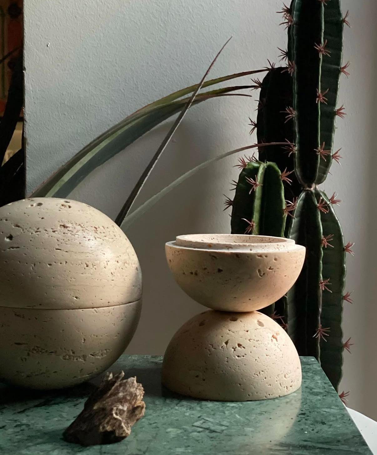 مبخرة من حجر الترافرتين الطبيعي بلونه البيج الدافئ وملمسه الخام الذي يعكس جمال الطبيعة وهدوءها.